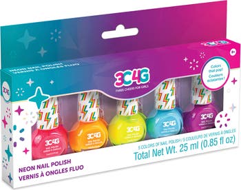 Be bright. Be bold. Be neon! These ultra-violet nail polishes add just the right amount of vibrancy to any look. Includes 5 nail polishes (0.27 fl oz. / 8 ml each). Imported. Non-toxic, water-based formulas. Make every mini manicure a photo-worthy one with neon nail polishes as vibrant as your little one’s personality. Their standout shades are perfect for adding an extra dose of colorful fun to any outfit. Includes five colors: Tangy Tangerine, Bubblegum Pink, Highlight Yellow, Neon Pool and Electric Periwinkle. These polishes last through playtime and come off simply by peeling off or with nail polish remover to make changing it up easy-peasy. Add a clear top coat for the ultimate shine! Safe to use, fun to wear, win-win. Whether it’s a birthday bash, playdate or slumber party, these versatile colors offer up the perfect playtime activity for little ones to explore their fun, creative sides while showing off their unique personality. PERFECT FOR AGE 8+