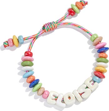 Get custom style and a personalized fit with this charming beaded cord bracelet outfitted with bubbly letter charms of your choosing.