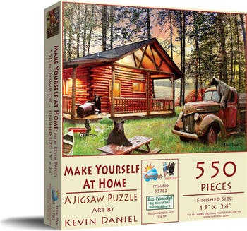Unleash your creativity with the "Make Yourself at Home" 550-piece jigsaw puzzle by SunsOut that not only transports you to the serene tranquility of a rustic cabin in the woods but also offers a chance to appreciate the artistry of renowned artist Kevin Daniel. Completed, the puzzle measures 15" x 24", showcasing a captivating scene of wildlife and nature coexisting in harmony. As an eco-friendly, American-made product, this jigsaw puzzle is constructed from quality recycled cardboard and printed using soy-based inks, reflecting SunsOut's commitment to sustainable practices. Enhanced by interlocking pieces and robust durability, the jigsaw promises a smooth assembly and repeated enjoyment, making it an ideal leisure activity. SunsOut's unwavering dedication to customer service stands out, ensuring any missing or damaged pieces are promptly replaced, leading to a worry-free puzzle experience. The remarkable, fully licensed artistry of Kevin Daniel brings every peaceful cabin scene element to life, enriching your journey into the world of jigsaws, whether you're a seasoned solver or a newcomer. Experience this delightful escape filled with beauty and innovation in the simple pleasure of piecing together the "Make Yourself at Home" jigsaw puzzle.