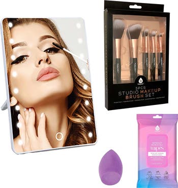 Makeup Essentials Set Brush Set, Wipes, Blender Sponge & Smart Vanity Mirror