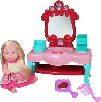LISSI: MAKE UP TABLE: 8" TODDLER DOLL, BRUSH & MIRROR - Elevate your child’s playtime with the delightful Lissi Make Up Table Set! This charming collection features an adorable 8-inch toddler doll dressed in a cute pink outfit, ready to inspire endless hours of imaginative role play. The set includes a stylish makeup table, a brush, and a mirror, all designed to create a fun and engaging experience for your little ones. As your child pretends to get their doll ready for outings, they’ll not only enjoy creative play but also enhance their fine motor skills while handling the accessories. This hands-on activity promotes organizational skills and fosters a sense of responsibility and independence, as they learn to care for their doll. In addition to developing self-care and hygiene habits, this set serves as a fantastic tool for teaching valuable lessons about grooming and personal care. Role play is essential for children’s development, as it helps to improve communication skills and encourages social interaction. Your child can create a variety of scenarios, enhancing their storytelling abilities and sparking their imagination. Designed for children ages 2 and over, the Lissi Make Up Table Set is the perfect gift to encourage creativity and provide endless fun. Doll set INCLUDES: 1 doll, 1 makeup table, 1 brush, and 1 mirror.