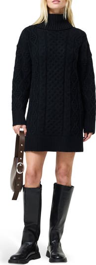 Dropped shoulders frame this woolly turtleneck sweater-dress knit in a leggy length and textured with cozy cable stitching.