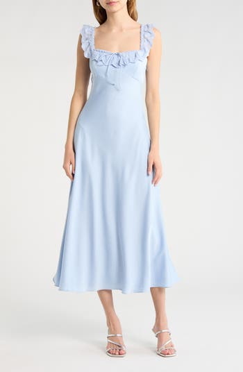 Channel timeless romance in this smooth satin dress accentuated with delicate lace trim.