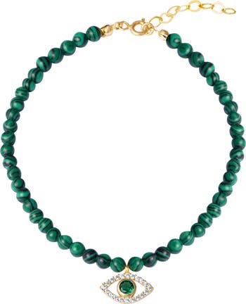 A delicate blend of symbolism and elegance, this Malachite Eye Anklet is designed to bring both beauty and meaning to your everyday style. Crafted with rich green malachite beads, this anklet is finished with a radiant gold evil eye charm centered with a deep emerald-hued stone and surrounded by shimmering crystals. The protective eye motif has long been believed to ward off negative energy, making this piece not only stylish but also meaningful. Lightweight and adjustable for the perfect fit, it’s an effortless accessory for beach days, summer outfits, or adding a subtle pop of color to your everyday look. Wear it alone for a delicate statement or layer it with other anklets for a modern stacked style
