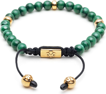 Classic beaded bracelet crafted by hand from beautiful green malachite and finished with stainless steel beads plated in gold. Designed with a durable nylon string and a gold-plated stainless steel drawstring lock for a secure fit. Each piece is handmade and one-of-a-kind, with slight variations in size, shape, and color.