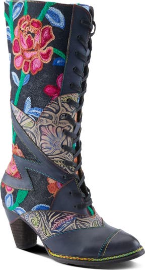 Colorful stitching and a mixed-media design add whimsical charm to a knee-high boot balanced by a slender cap toe and stacked block heel.