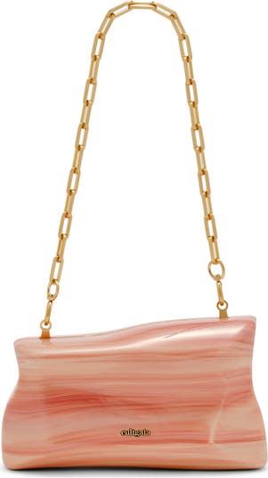A glossy finish and marbleized streaks emphasize the sculptural aesthetic of this statement-making hardshell clutch suspended from a gleaming chain strap.
