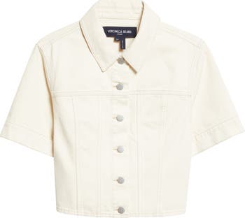 Layer up your look in casual-chic style with this short-sleeve jacket fashioned from crisp nonstretch denim.
