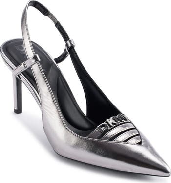 Signature logo hardware enlivens the instep of a pointy-toe slingback pump set on a cushioned footbed and slender heel for lasting wear.