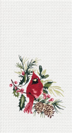 Introducing the Male Cardinal Botanical Embroidered Waffle Weave Towel. This beautiful cotton towel is all about merry and bright. Featuring our favorite majestic holiday bird, the male red cardinal, perched atop spruce branches and leafy twigs, holly berries, and pinecones, it's sure to add some festive cheer to any kitchen.