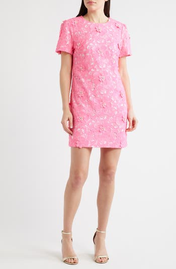 Beaded floral appliqués decorate a playful lace shift in a color-pop pink.