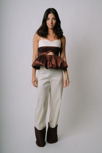 Elevate your wardrobe with the sophisticated Malena Top, an exquisite two-toned garment designed to make a truly distinctive statement. Crafted from luxurious taffeta, it boasts a structured silhouette and a subtle, captivating sheen that transitions seamlessly from formal events to upscale casual gatherings. The design features a contrasting neckline, beautifully complemented by delicate spaghetti straps and a tastefully daring front cut-out accentuating the mid-section. A voluminous peplum hem adds dramatic flair, creating an undeniably flattering and fashion-forward profile. This impeccably designed top masterfully blends classic elegance with contemporary style. Its meticulous details, from the artful blend of colors to the unique silhouette, ensure you exude confidence and grace. Versatile and refined, this piece promises to be a cherished addition to any discerning wardrobe, offering endless styling possibilities for a memorable look.