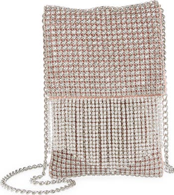 Covered in dazzling rhinestones, this slender crossbody bag with a foldover top is the perfect accessory for your next special occasion.