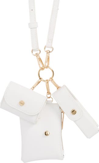 Give all of your small essentials a home of their own with this lanyard that features a card case, lipstick case and coin purse with shiny goldtone hardware.