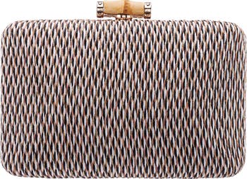 Intricately woven straw and a bamboo-inspired clasp add a boho aesthetic to a structured frame clutch featuring an optional chain strap for hands-free wear.
