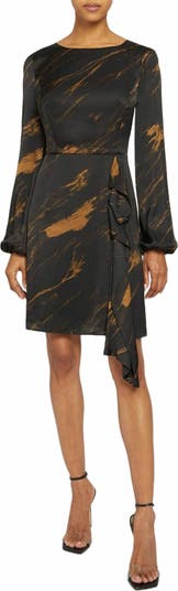 Long Sleeve Dress with Side Ruffle Panel in Abstract Print