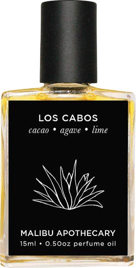 Golden Jojoba Oil and Essential Oil-infused fragrances in a travel roller perfume. Los Cabos scent with notes of Cacao, Agave, and Lime for a scented vacation in a bottle.
