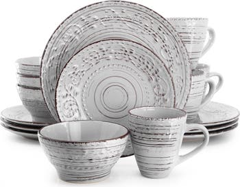 Elevate your dining experience with the Elama Malibu Calcite 16-Piece Stoneware Dinnerware Set in Light Gray, designed to bring a touch of coastal charm to any meal. This luxurious set includes four dinner plates, four salad plates, four bowls, and four mugs, making it perfect for serving up to four people. Crafted from durable stoneware, each piece is finished with a reactive glaze that gives a unique, artistic touch. The embossed pattern and hand-painted swirl details add a distinctive flair to your table, while the light gray hue evokes a classic, beachy feel that's ideal for both casual meals and festive gatherings.The Elama Malibu Calcite Dinnerware Set not only offers stunning style but also practical functionality. Its microwave-safe and dishwasher-safe features make it convenient for everyday use, while the specialty polygonal and round shapes bring a modern yet coastal aesthetic to your home. Whether you're enjoying a laid-back dinner or hosting a beach-themed party, this dinnerware set adds a sophisticated touch to any occasion. Make every meal feel like a getaway with this beautifully designed set that seamlessly blends artistry, durability, and convenience.