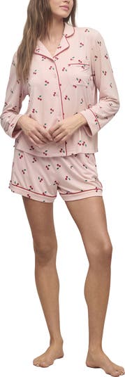 A playful cherry print brings cheerful charm to this pajama set made from soft, stretchy jersey for all-night comfort.
