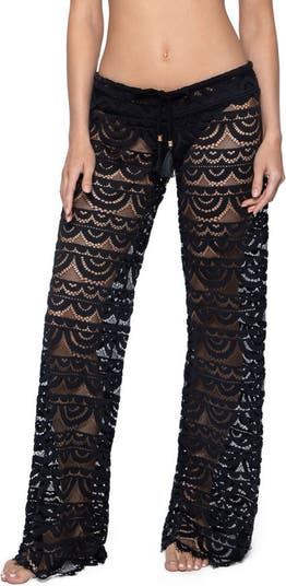 An eye-catching lace pattern highlights these semisheer cover-up pants further complemented by a raw, scalloped hem and tasseled drawstring waist.