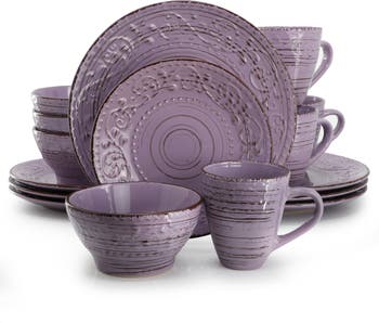 Elevate your dining experience with the Elama Malibu Mica 16-Piece Stoneware Dinnerware Set in Purple, designed to bring a touch of coastal charm to any meal. This vibrant set includes four dinner plates, four salad plates, four bowls, and four mugs, making it perfect for serving up to four people. Crafted from durable stoneware, each piece is finished with a reactive glaze that gives a unique, artistic touch. The embossed pattern and hand-painted swirl details add a distinctive flair to your table, while the purple hue evokes a springtime vibe and is perfect for both casual meals and festive gatherings.The Elama Malibu Mica Dinnerware Set not only offers stunning style but also practical functionality. Its microwave-safe and dishwasher-safe features make it convenient for everyday use. Whether you're enjoying a laid-back dinner or hosting a spring-themed party, this dinnerware set adds a fun and lively pop of color to any occasion. Make every meal feel like a getaway with this beautifully designed set that seamlessly blends artistry, durability, and convenience.