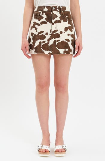 Ride into the season in this cow-print denim mini designed in a classic five-pocket style with bold rodeo-ready attitude.