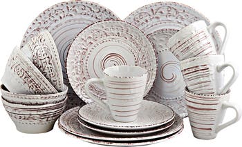 Experience a beachy dinner experience with this elegant dinnerware set. The Malibu Sands set features a beautiful hand paint work, laid on a sand embossed stoneware, that will transport you to the coast with every mouthful. Subtle enough for intimate dinners yet its singularity makes it ideal for hosting parties and bigger gatherings.This beautiful set includes: Four 10.75 in. Dinner Plates, Four 8.25 in. Dessert Plates, Four 6 in. Bowls, and Four 12 oz. Mugs The Elama Malibu Sands 16-Piece Set is stoneware dinnerware is dishwasher safe for easy cleaning. It is also Microwave and Oven safe.