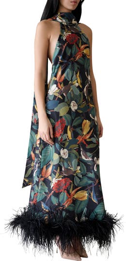 - Floor-length design with feather-trimmed hem