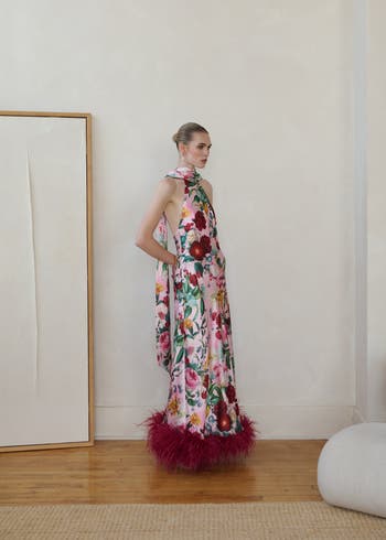 Radiate timeless elegance in the Maliya Feather Dress, a statement piece crafted for unforgettable moments. Made from lustrous satin fabric, this floor-length gown showcases a vivid floral print that blooms with romance and sophistication. Thehalter neckline and open back create a striking silhouette, while an adjustable clip closure at the neck ensures a perfect fit.