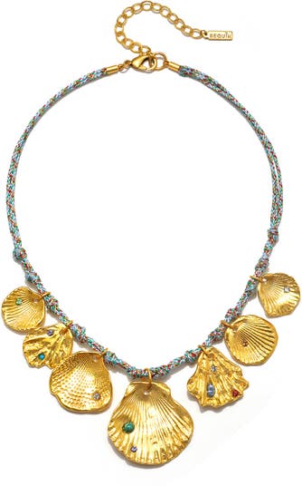 Answer the siren call of faraway beaches when you wear this mesmerizing necklace layered with textured glass and ocean-inspired charms. Each charm is cast from a genuine natural seashell to capture its intricate, organic shape.