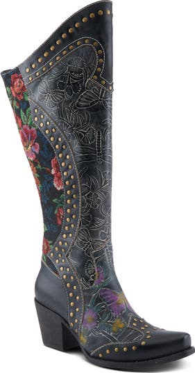 Mixed textures and antique studs add visual intrigue to a knee-high boot balanced by a slender toe and chunky block heel.