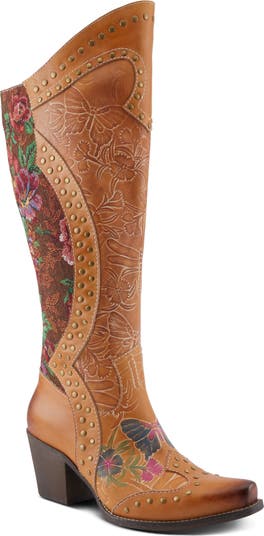 Embossed butterflies and hand-painted flowers enrich this knee-high Western boot balancing a studded leather shaft with a tapestry-inspired back panel.