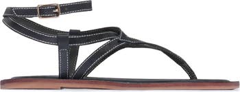 Tried and True. Bringing back this strappy archival design to adorn your feet. With a geometric cut thong upper and a wrap around ankle strap, your summer stride has style secured.