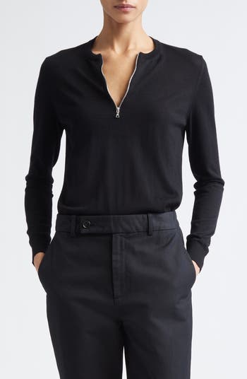 A sporty zip adds shine and utility to this fine-gauge sweater knit from soft virgin wool.