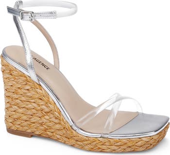 Slim, translucent straps add futuristic flair to an espadrille-inspired sandal lofted by a raffia-wrapped platform and soaring wedge heel. Memory foam cushioning delivers optimal underfoot comfort.