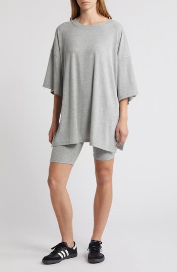 Feel comfortable and look polished in this stretchy, ribbed set that pairs an oversized T-shirt with matching bike shorts.