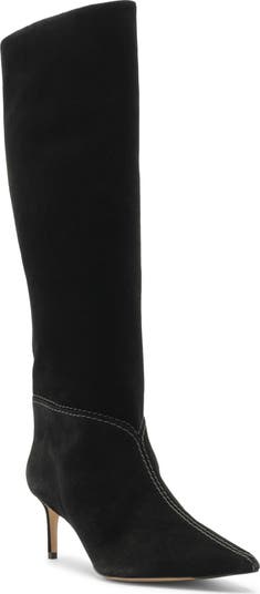 Contrast topstitching draws attention to the pointy toe of this knee-high boot that radiates sophistication and contemporary elegance in scamosciato leather and a minimalist aesthetic. The mid heel makes this style an ideal day-to-night option.