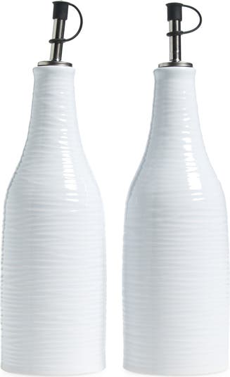 Made from textured glazed stoneware that protects their contents from the light, these bottles make it easy to drizzle oil and vinegar while cooking or at the table. The accompanying tray gives this set a handsome home.