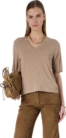 Lightweight tee with graceful drape and clean V-neck, tailored for relaxed city days and weekend sophistication.