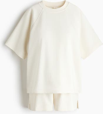 Set with a T-shirt and pair of shorts in lightweight sweatshirt fabric. T-shirt with a crew neck, raglan sleeves and a straight-cut hem with a slit at each side. Shorts featuring a low waist with smocked elastication and a drawstring. Discreet side pockets and a small slit at the hems. The set can be worn both during and after pregnancy.