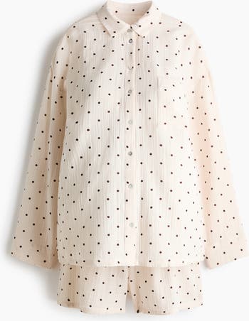 Pyjamas with a shirt and pair of shorts in soft cotton muslin. Shirt with a collar, buttons down the front, a patch chest pocket, dropped shoulders and long sleeves. Shorts with a low, elasticated, drawstring waist for a comfortable fit both during and after pregnancy.