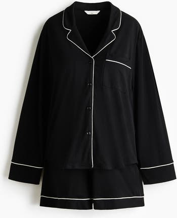 Pyjamas with a shirt and pair of shorts in soft, viscose-blend jersey with piping. Long-sleeved shirt with a resort collar, buttons down the front, gently dropped shoulders and an open chest pocket. Shorts with covered elastication at the waist for a comfortable fit both during and after pregnancy.