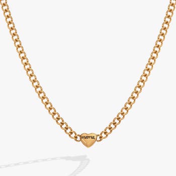 For the one who does it all. This trendy gold-tone curb chain necklace features a bold, heart symbol engraved with Mama—because no title shines brighter. A modern classic for the moms who make magic happen every day.