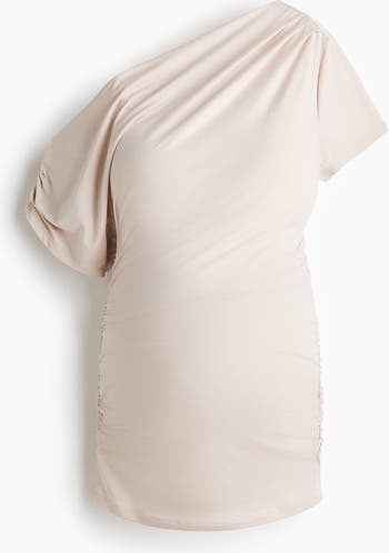 Top in stretch jersey with an asymmetric neckline, short sleeves and gathered seams throughout the design to create a draped effect.