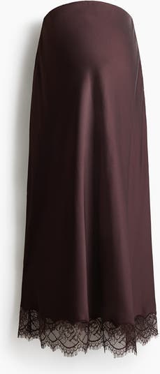 Ankle-length skirt in softly draping satin featuring a high waist with concealed elastication, darts at the back for a comfortable fit over the tummy and a scalloped lace trim at the hem. Unlined.