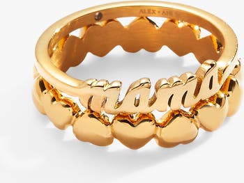 Stack your love. This two-piece ring set includes a gold-tone script ring that spells Mama and a matching band of repeating hearts in an alternating pattern. With an adjustable fit, it’s made to be worn together or separately—because love is infinite.