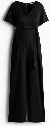 Loose-fit jumpsuit in textured jersey featuring a V-neckline, an opening with a button at the back of the neck and short sleeves. Tie belt under the bust and straight legs.