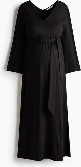 Calf-length dress in soft jersey with V-neckline at the front and back, long sleeves with a slit at the cuffs and a detachable tie belt below the bust. Straight-cut hem with a slit at each side.