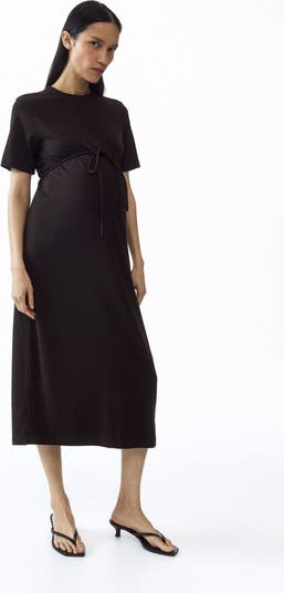 Loose-fit, calf-length T-shirt dress in soft jersey made from a cotton and viscose blend. Round neckline, short sleeves, and a narrow tie belt below bust. Straight-cut hem with a high slit at back.