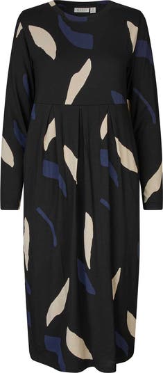 A timeless Masai tulip dress in soft jersey with a bold graphic print. Featuring a round neck, long sleeves, discreet side pockets, and a feminine tailored fit with fine pleats for comfort and elegance